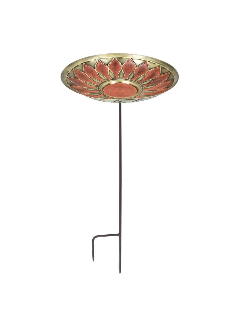 This Red African Daisy Birdbath with Stake has a generous brass bowl with a bold embossed sunburst pattern with red patina accents. A threaded base on the underside of the bowl attaches to the stake. Perfect for birdwatching on porches, balconies or decks.