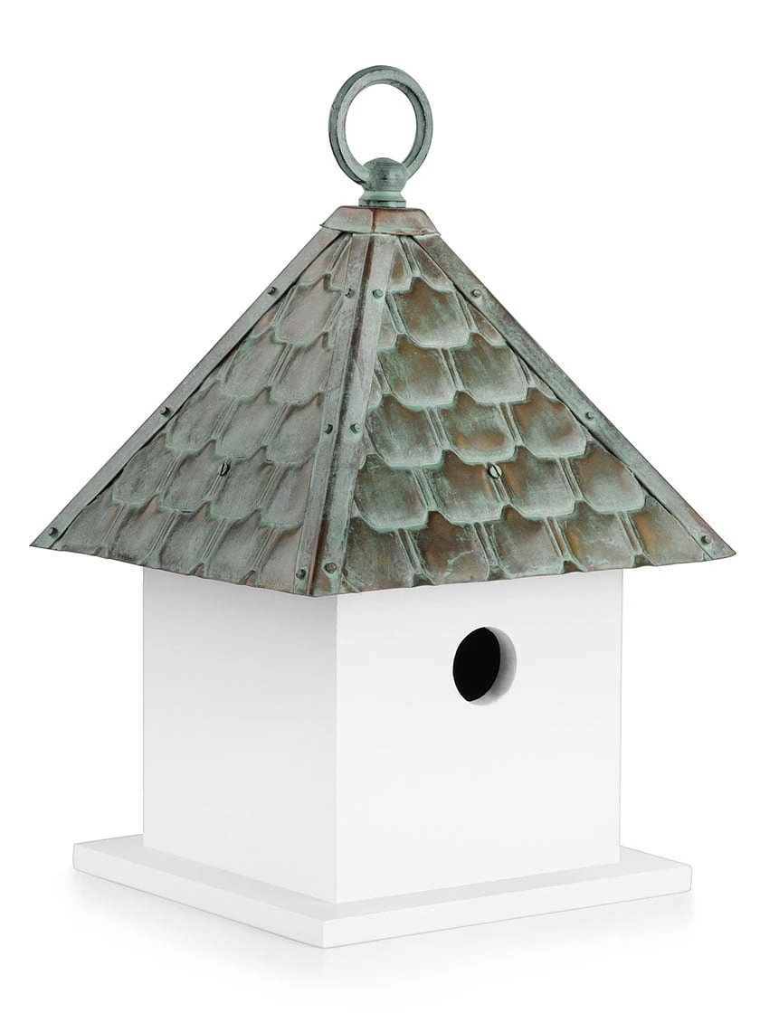 Friends of flight will find delight in this beautiful Bungalow Bird House painted white and topped with verdigris copper. Attracts small feathered-friends with the 1 1/8″ perch-less entry protects from nest-raiding paws, giving birds the freedom to enjoy their home. The base is made of a long-lasting, mango hardwood with a generous 3” hole on back and sliding copper door making clean-up a breeze. Air vents circulate fresh air through the space and drainage holes are in the base.
