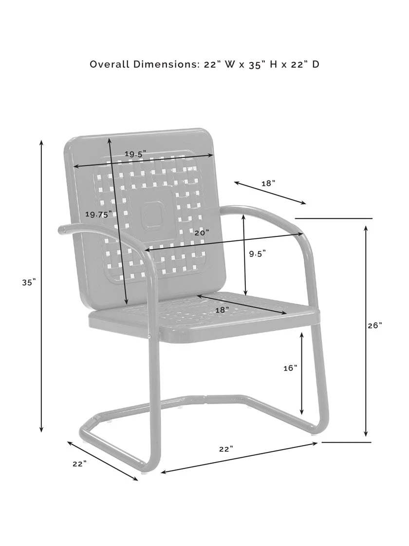 Nostalgia abounds with the Bates 3pc Chair Set. Two vintage-style chairs in vibrant colors surround a simple metal side table for a fun and functional outdoor lounging experience. Each chair features a square back with a unique basket weave design allowing air to circulate for added comfort. With a cantilever base, the chairs offer just enough flex for relaxing outdoors. The table’s sturdy pedestal base easily tucks between the chairs, making the Bates 3pc Chair Set ideal for smaller outdoor spaces.