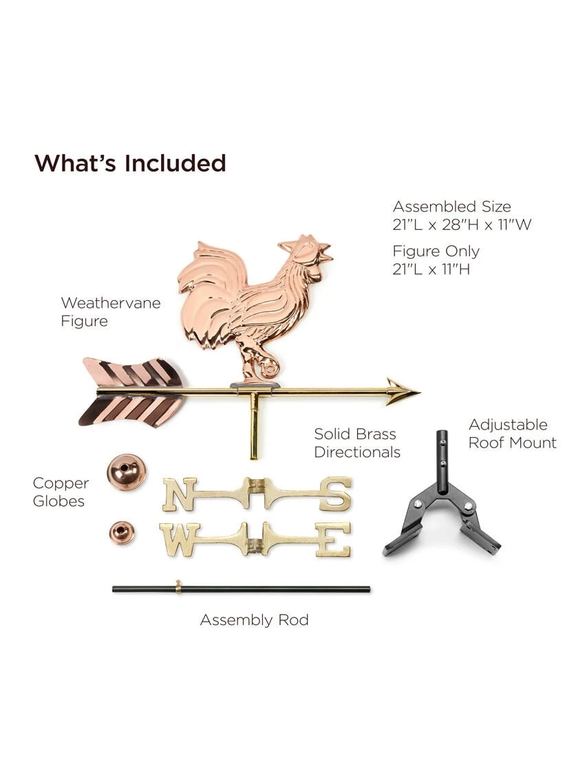 With chest and tail feathers proudly puffed out, this rooster is ready to adorn the rooftop of smaller structures, sheds, and gazebos. For over 35 years Good Directions Pure Copper Weathervanes have been unsurpassed in style, quality, and durability – perfect for the house-proud homeowner. Bring the Joy of Outdoor Living℠ to your home with this heirloom-quality piece. Easy-to-assemble and install. The pure copper will age naturally over time.